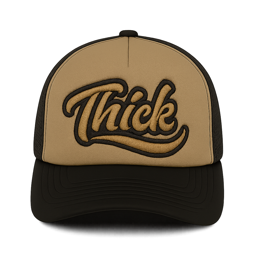Bold, confident, and unapologetically stylish — the “Thick” Script Trucker Hat in Black & Khaki is made to turn heads. This premium trucker cap features a striking embroidered “Thick” logo in a rich tan thread outlined in black, perfectly balanced on a structured tan front with breathable black mesh backing.