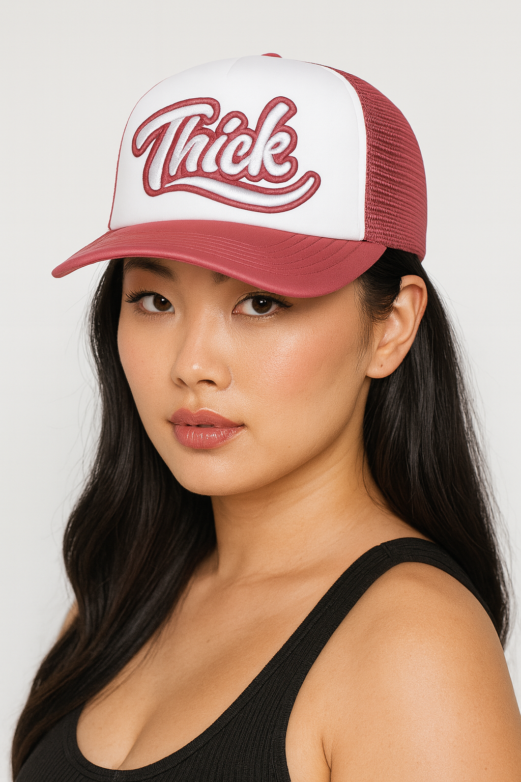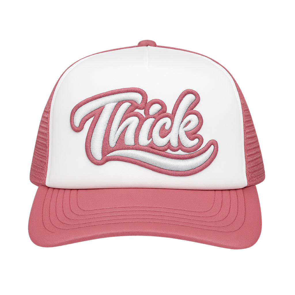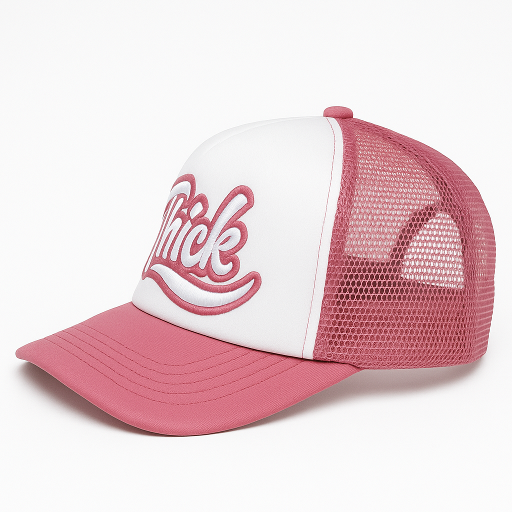 Bold. Confident. Unapologetically you. The “Thick” Trucker Hat makes a statement before you even say a word. Designed with a vintage script and embroidered in crisp white and rose pink, this cap fuses street style with playful charm. The breathable mesh back keeps it cool, while the structured front panel holds its shape all day.