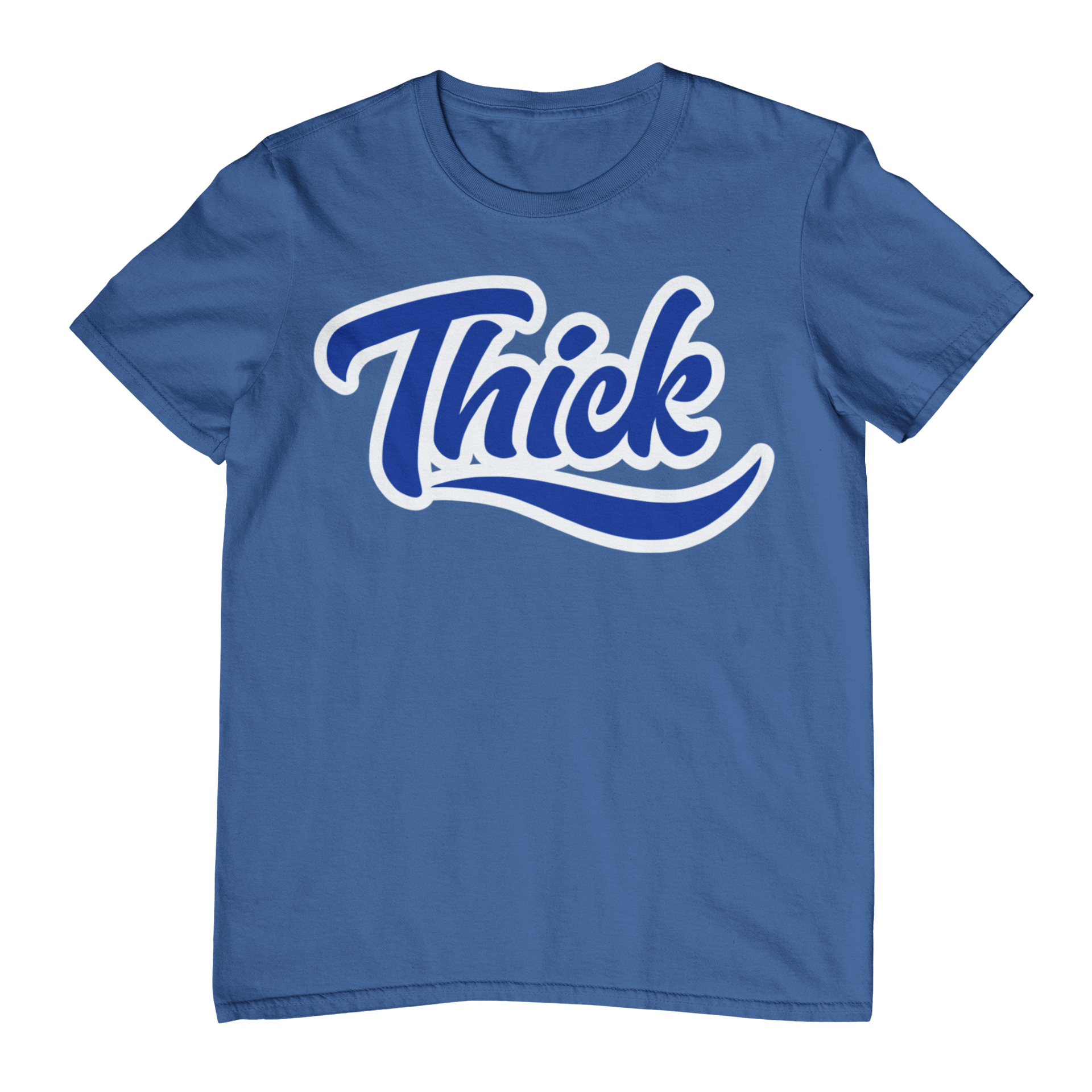 Bold “Thick” script design in white with royal blue shadow