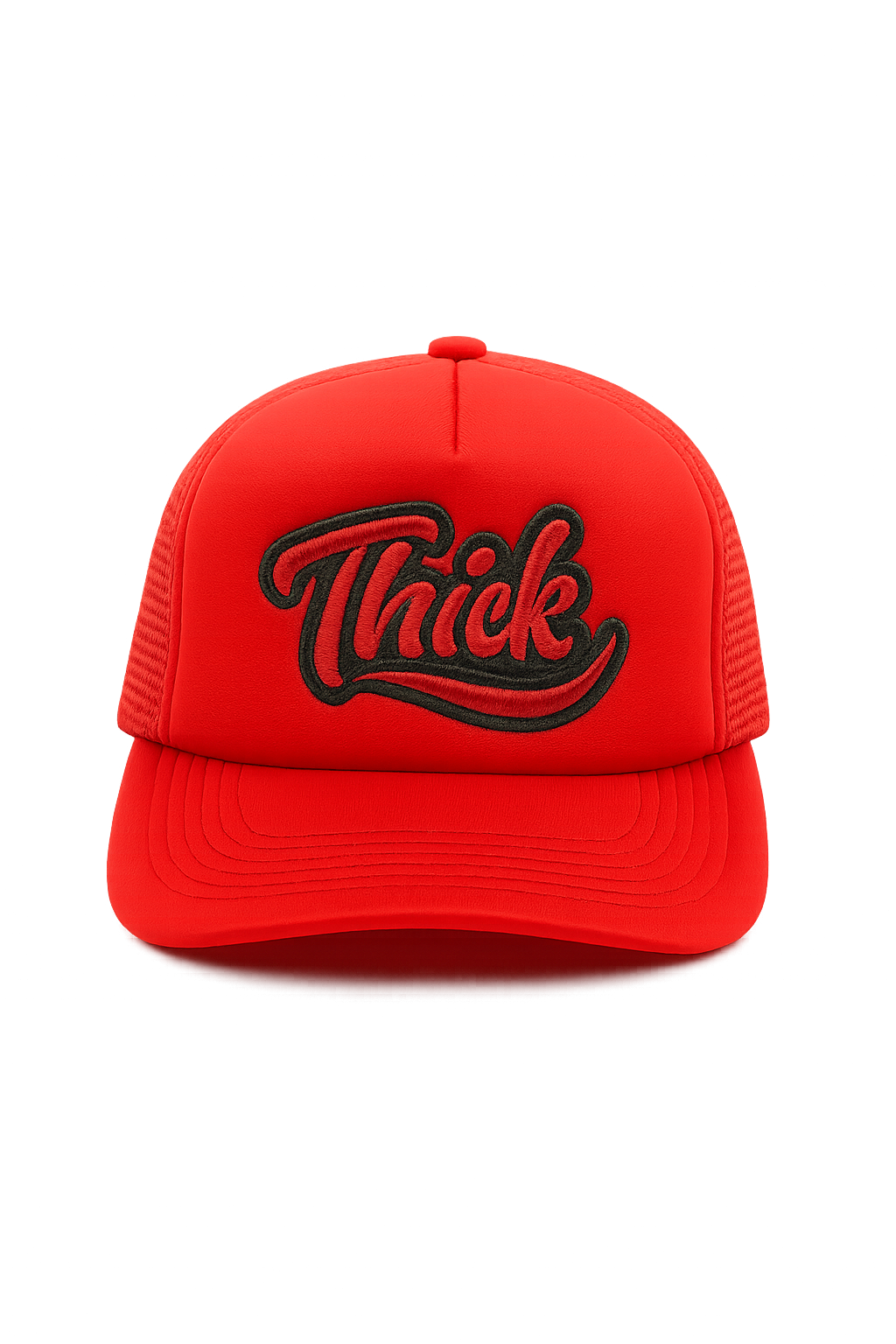 Turn heads and make a bold statement with the “Thick” Bold Red Trucker Hat. Designed for those who wear confidence as part of their style, this high-quality snapback features a vibrant red base with a striking red embroidered “Thick” script logo across the front panel. The smooth foam front offers structured comfort, while the breathable mesh back ensures all-day wearability.